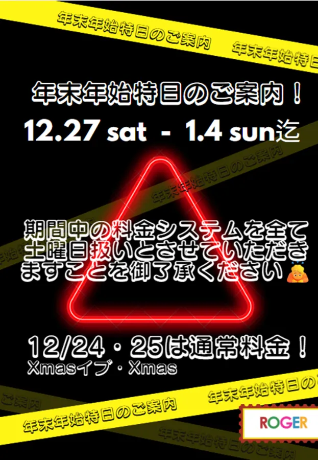 12.27sat~1.4sunまでの期間の料金システムを全て土曜日扱いとさせていただきます